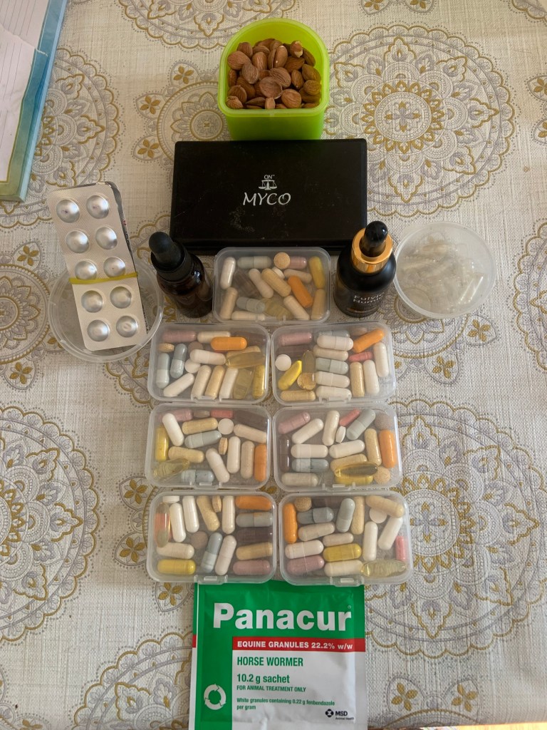 Fenbendazole is one of those treatments, and the next step is to add in more similar parasite treatments, in order to target all the different kinds of parasites, in all stages of their development. This must be done gradually or it can make you feel ill. I’ve been taking fenben for two weeks now, with no adverse reactions, so I’m ready to add the next one, Ivermectin, which has now arrived from India. After that I will add Methylene Blue, and then Chlorine Dioxide. The supplements I need to take alongside these have arrived, thanks to all you lovely people donating to my fundraiser.